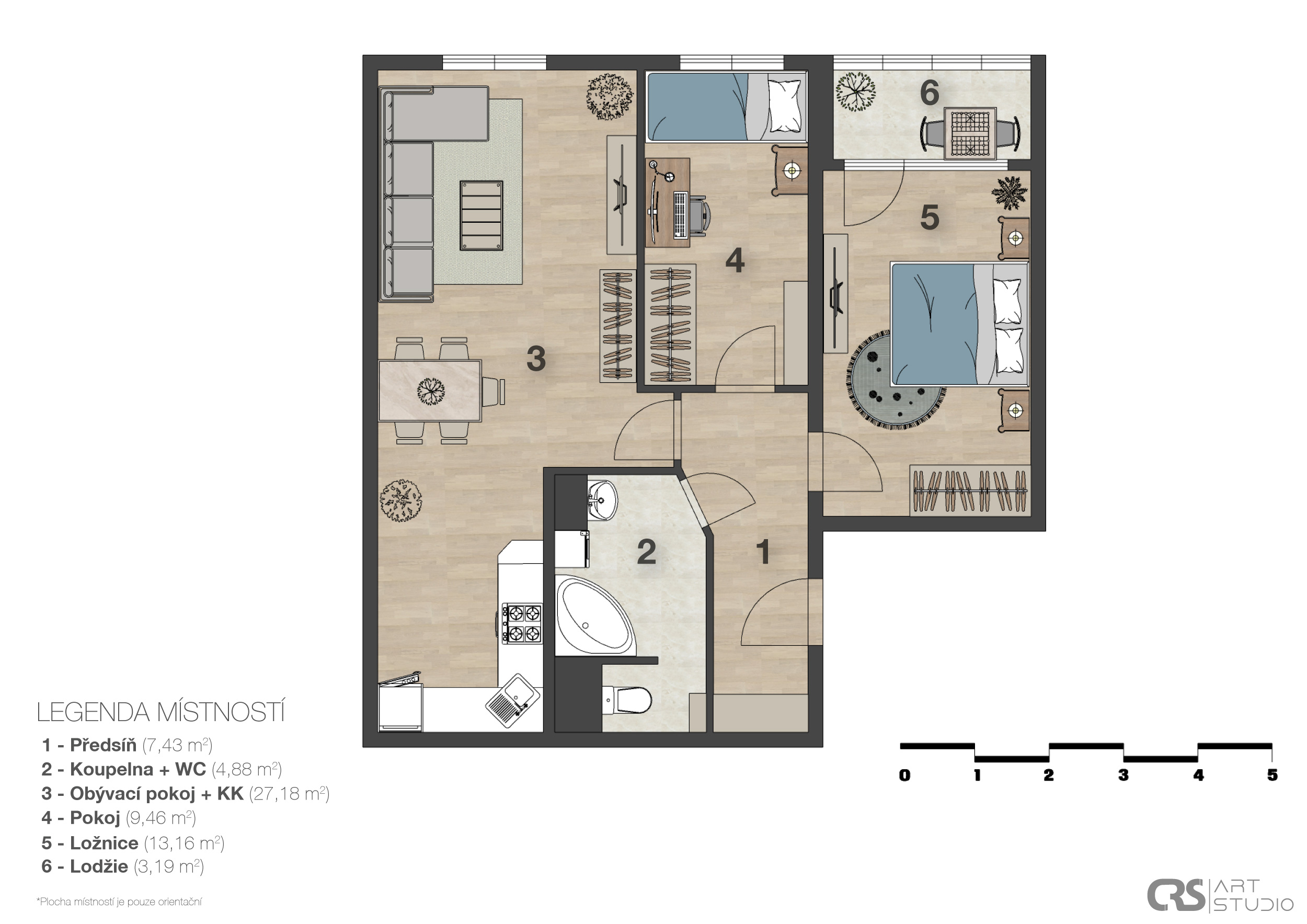 Vyzděné jádro, plastová okna, zasklená lodžie, sklep a celková užitná plocha 67 m2 (byt 62,11 m2 + lodžie 3,19 m2 + sklep 1,62 m2). To je rychlá vizitka panelákového bytu ve 2. nadzemním podlaží v osobním vlastnictví, který vám může už brzy říkat pane. Jeho srdcem je obývací pokoj s kuchyňským koutem (27,18 m2). Dva další pokoje (13,16 m2 a 9,46 m2) pak můžete proměnit v ložnici a dětský pokoj. Protože jsou všechny pokoje orientované na východ, nedostatkem světla trpět nebudete. Vyzdění jádra a nové rozvody v něm pak umožnily vznik koupelny spojené s WC, do které se díky její ploše (4,88 m2) vešla i rohová vana. Předsíň (7,43 m2) pak nabízí úložné prostory. A co se nevejde do nich, to můžete uložit do sklepa, který k bytu také patří. Samotný panelový dům je revitalizovaný zateplený a v energeticky úsporném standardu ve třídě C. Vchod je klidný, čistý a udržovaný. SVJ v domě funguje bezvadně. Pravidelné zálohy do fondu oprav a na služby jsou ve výši 4500 Kč. Majitelé platí 130 Kč měsíčně za plyn, 600 Kč za elektřinu a 380 Kč za internet. Koupi bytu je možné financovat hypotečním úvěrem, s jehož zajištěním vám rádi pomůžeme, a nebo převzetím hypotéky od majitelů bytu (na 30 let ve výši 4,7 mil. Kč s desetiletou fixací úrokové sazby 1,99 %, s měsíční splátkou 18 419 Kč).